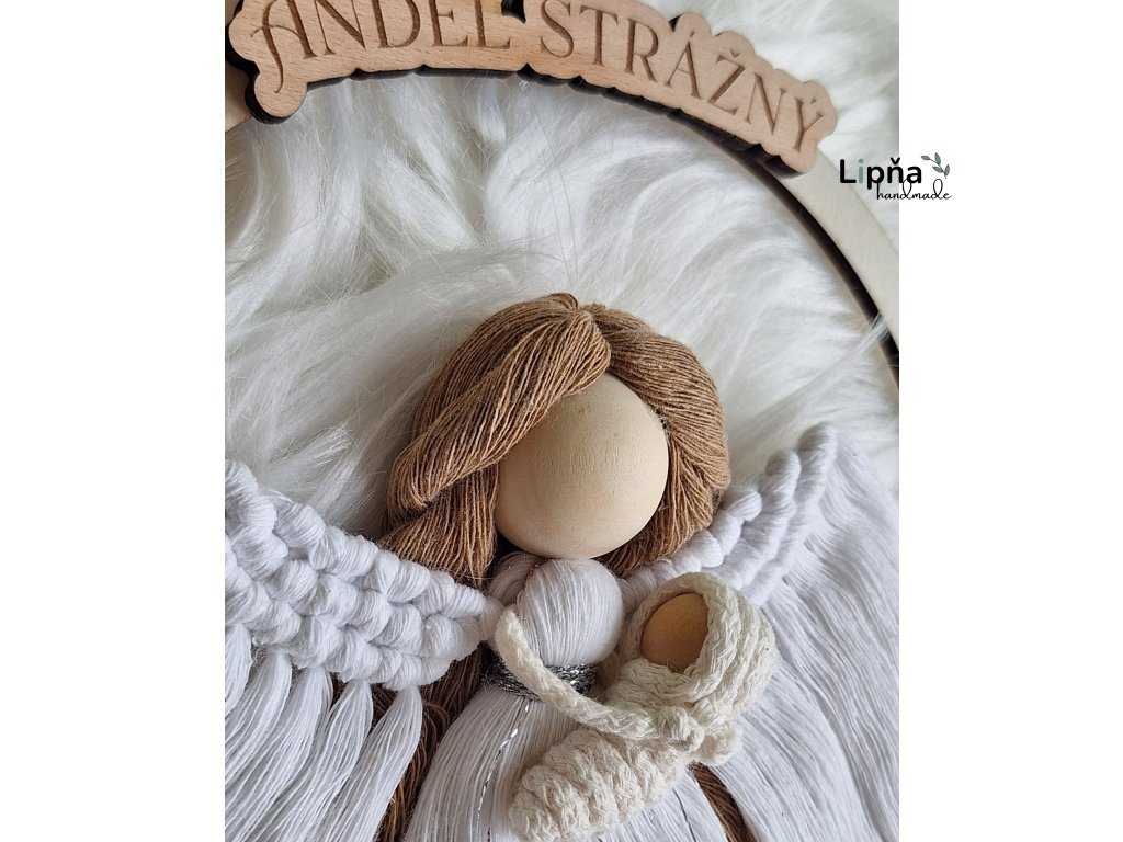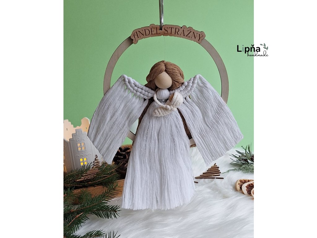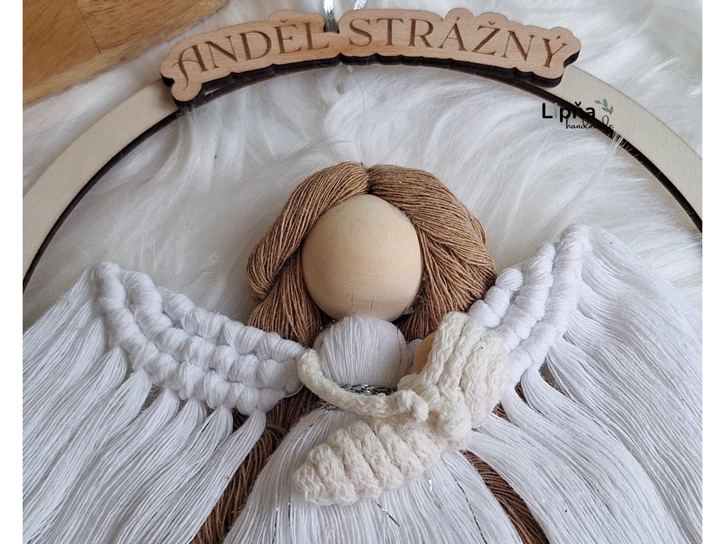 - Andělka je připevněna v dřevěném kruhu o průměru 18 cm