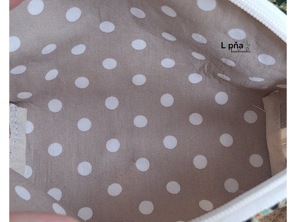 Kosmetická taštička oválného tvaru. Zapínání na zip s dvěma jezdci. Vyztuženo.